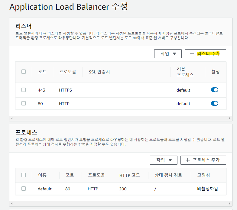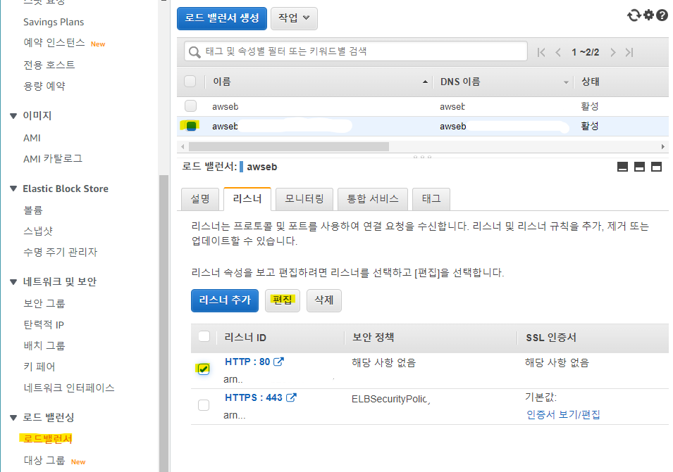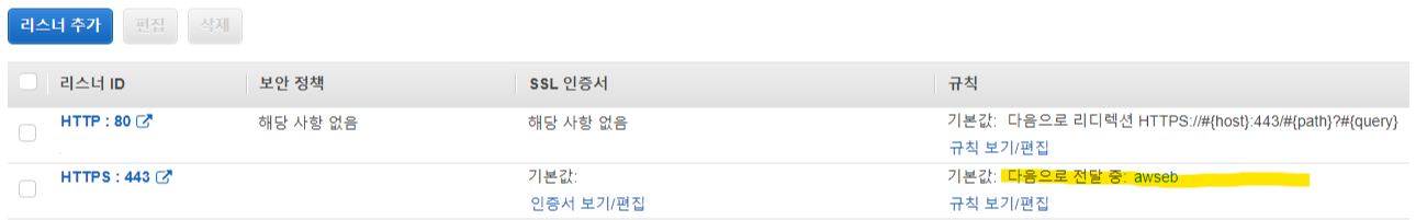 8. 하단 리스너 탭에서 HTTP : 80, HTTPS : 443 추가여부 확인 (Elastic Beanstalk 로드밸런서에 등록한 항목과 일치해야함)