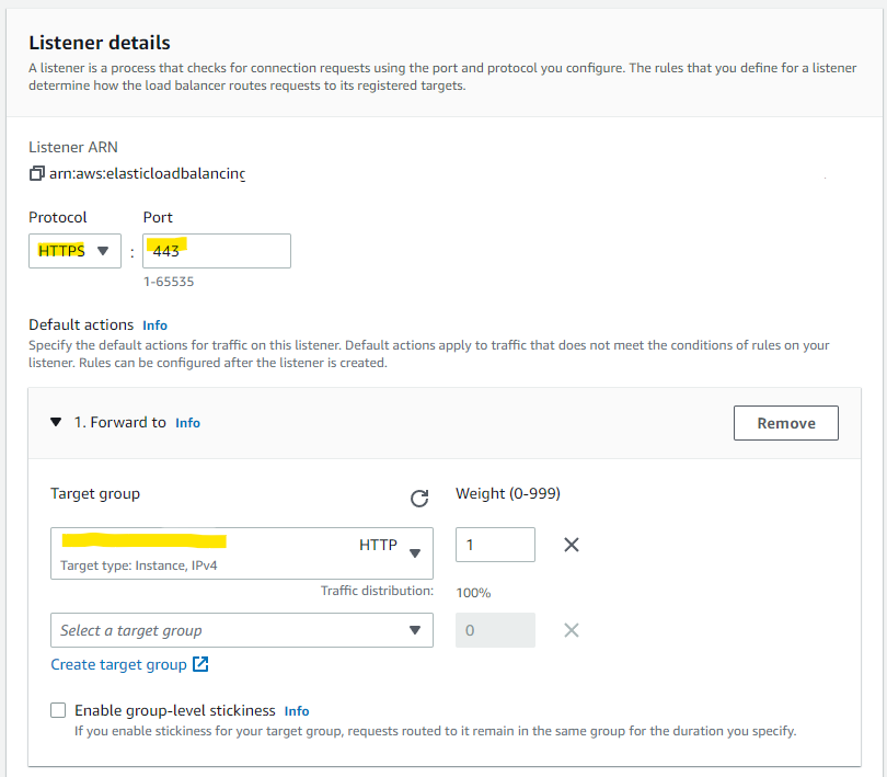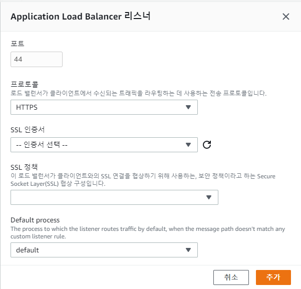 3. 리스너 추가 (port: 443, protocol: https, SSL인증서 선택, SSL 정책 선택, process 지정)