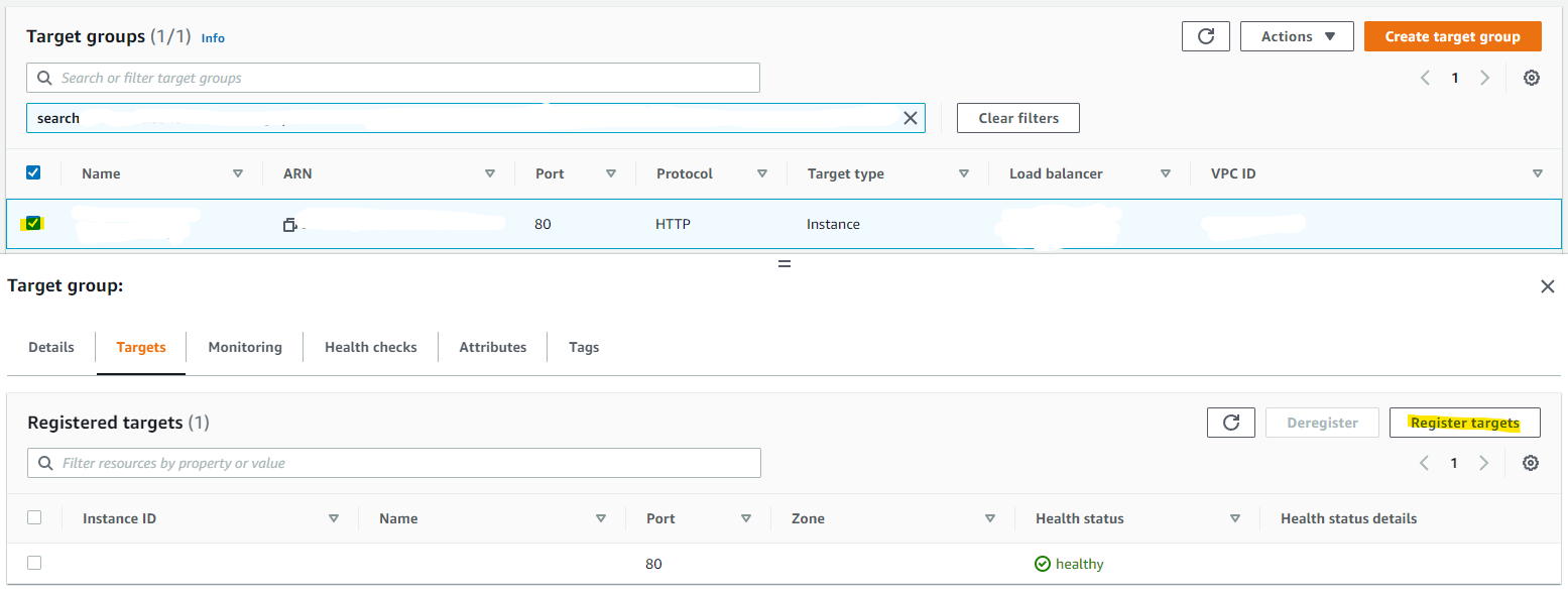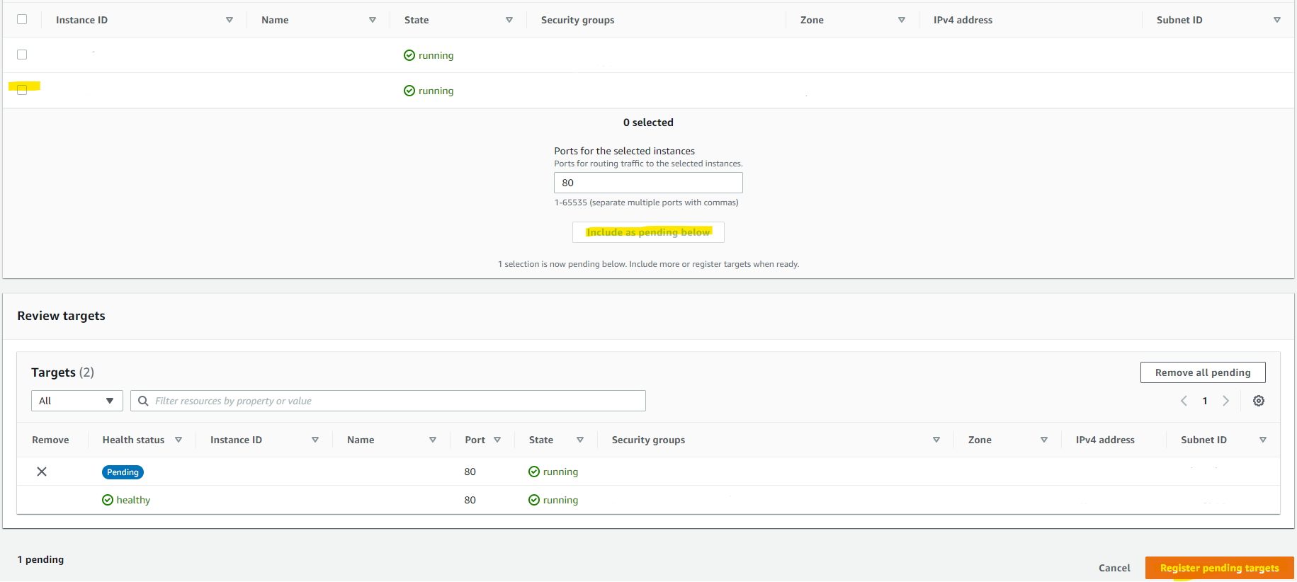 15. 하단 Targets 탭 - Register targets 클릭 - 원하는 인스턴스 체크박스 클릭 후 Include as pending below 버튼 클릭 - 하단 우측 Register pending targets클릭