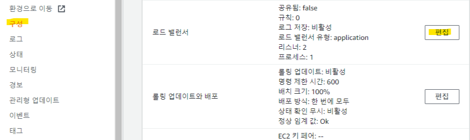 2. 좌측 환경 이름 - 구성(configuration) - 로드 밸런서 편집 메뉴 진입