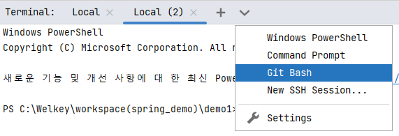 1. Git Bash 설치 후 터미널 Git Bash로 변경 (공식홈페이지에서 다운로드 후 설치)