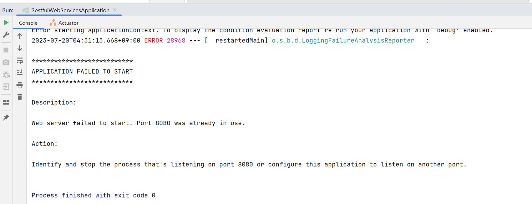 스프링부트를 공부하며 REST API 만들기 프로젝트를 진행 중인데, 어제까지만해도 잘 되던 포트가 갑자기 사용 중이라는 메시지를 받았다. 프론트 앱 없이 오로지 백엔드 프로그램 하나만 로컬로 돌리면서 테스트하는 상황이다보니 다른 프로그램이 8080포트를 쓸 일이 없는데 아무리 봐도 이상해서 각 프로세스가 사용 중인 포트를 확인해보기로 했다.