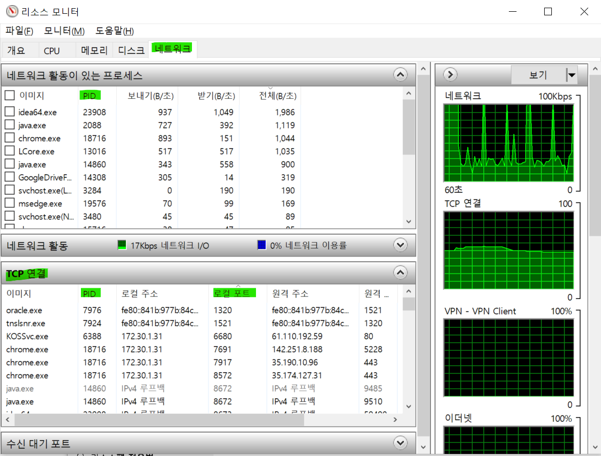 - 해당 프로세스 PID를 확인 후 상단 네트워크 활동이 있는 프로세스에서 PID로 프로세스를 찾아 우클릭 후 프로세스 끝내기(필요한 경우 프로그램 삭제)