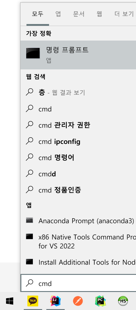 - 시작버튼 클릭 - cmd 입력 - 명령 프롬프트 실행