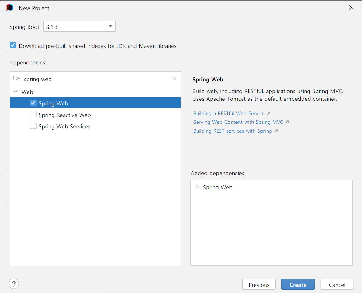 Create 버튼을 눌러 프로젝트를 생성하면 의존성을 다운로드하고 프로젝트를 구성하는 데에 시간이 조금 걸립니다.